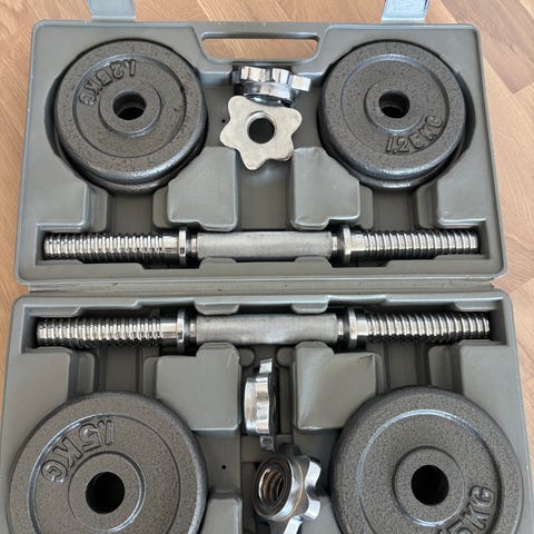 Två svarta hantlar på 5 kg styck, säljes som par. Bra greppvänlig form och lätt att ha hemma för träning.