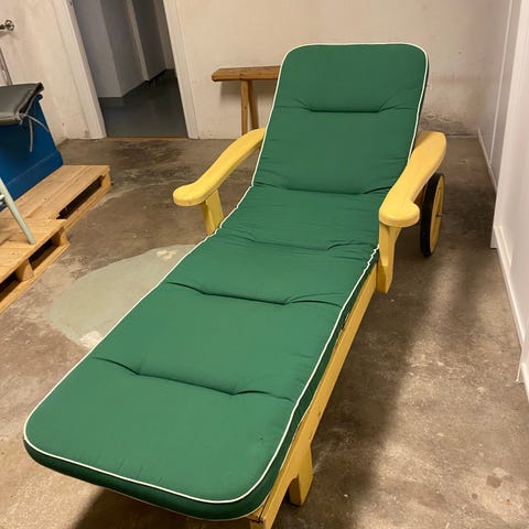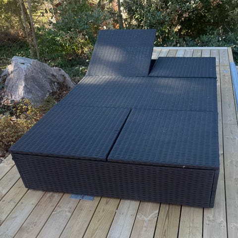 Två solstolar i konstrotting med gråa dynor. Ryggstöden är ställbara.