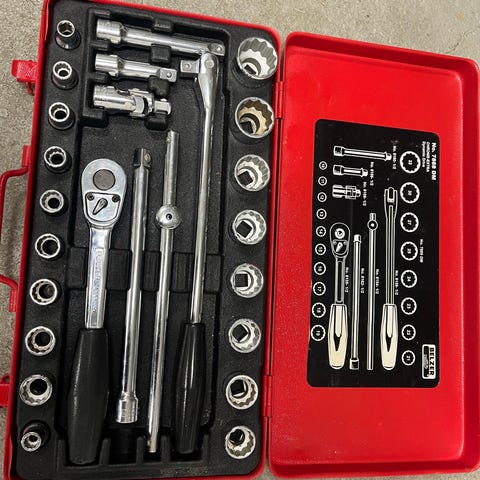 Hylsnyckelsats med flera olika hylsor och spärrskaft säljes tillsammans med domkraft skaftet saknas, Metallåda ingår till hylsorna så allt är samlat och lätt att ta med. Pris 500:- eller bud hämtas i borlänge