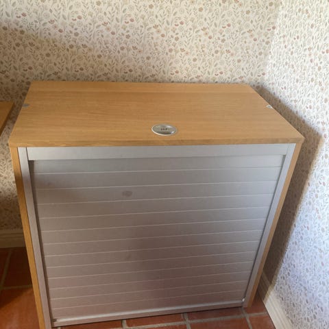 Stor plastlåda med skjutbart lock, bra för förvaring under säng eller i förråd. Har handtag på locket och hjul under för att lätt kunna dra ut den.