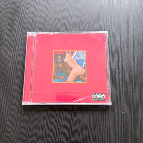 CD-skiva med Kanye Wests album Late Registration i originalfodral. Både fram- och baksida har omslag med låtlista och info tryckt på.