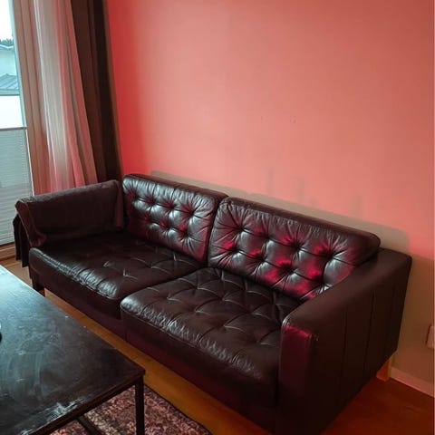 Skinnsoffgrupp i mörkblått. Väl använd med normalt slitage och några tydliga bruksspår, men fortfarande bekväm och i bra skick.