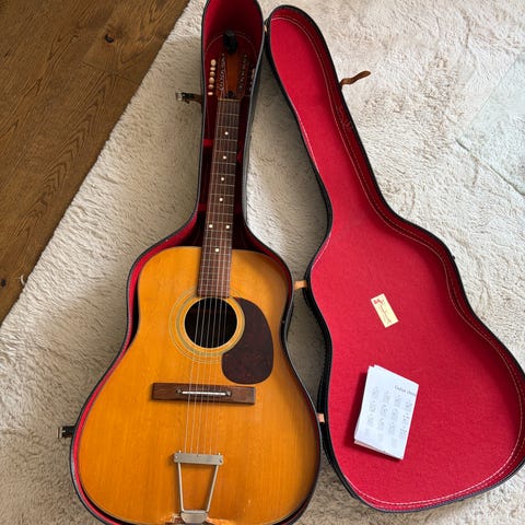 Akustisk nylonsträngad gitarr i natur träfärg med klassisk kropp. Lätt att spela på. Bra nybörjargitarr. Trevligt ljud. Har rosett runt ljudhålet och traditionell stall- och halsdesign.