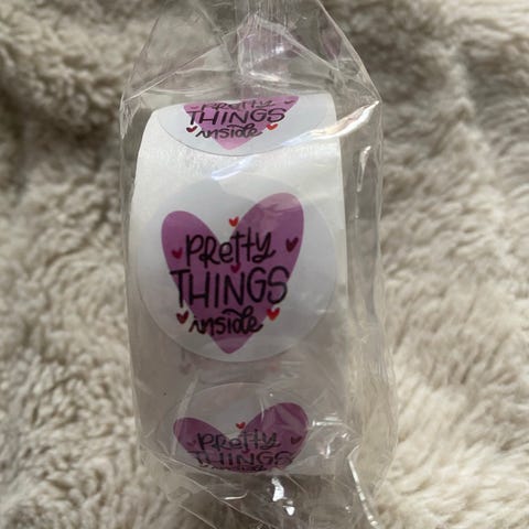Rulle med runda klistermärken med texten "thank you" i lila/rosa ton. Bra till paket, kort eller påsar när du vill skriva tack på ett enkelt sätt.