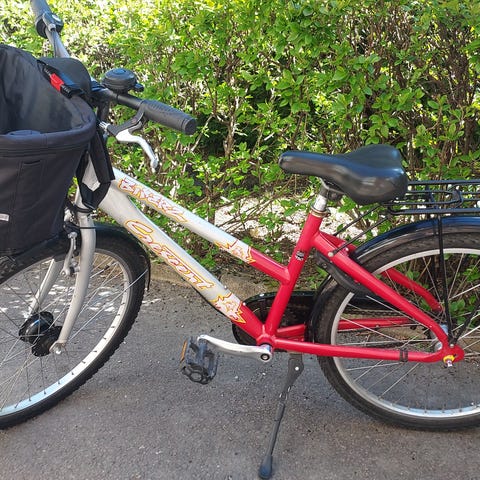 Blå Crescent barncykel med 24" hjul och 18 växlar. Utrustad med skärmar, handbromsar fram och bak samt stöd.