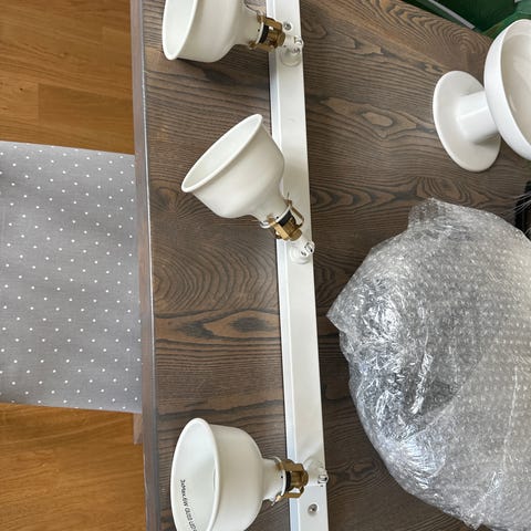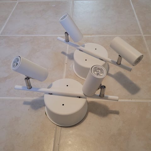 Vit takspot från Ikea med tre riktbara lampor. Monteras i taket och har enkel anslutning i dosan på baksidan. Har 6st