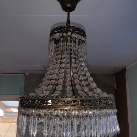 Kristallkrona i antik mässing, 6 armad rund 55 cm, höjd 70 cm, pris 3200 kr eller kom med bud.