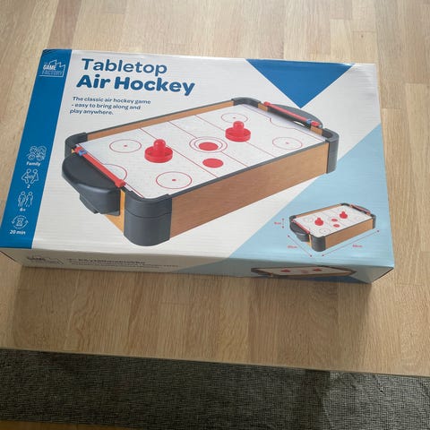 Hockeybord i svart med röda spelpuckar och klubbor. Står på ben och har markerad spelplan med linjer och cirklar. Den är bra och ny med laddare och alla puckar man kan diskutera om priset !