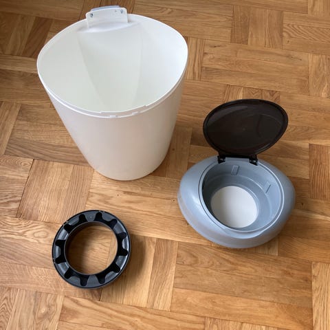 Tommee Tippee blå blöjhink med lock upptill. Enkel att öppna och stänga och med insats som håller blöjpåsen på plats.