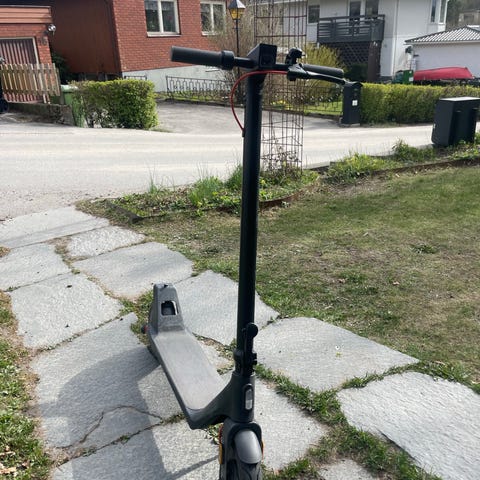 Elsparkcykel i svart och grått med bred fotplatta. Har stötdämpare fram, ringklocka på styret och baklampa. Den har en skada på reflexerna vid hjulet men inte står och en liten bit av reflexen är av som på bilden. Den har 600 km på sig och kör 20 km. Du får också kvitto som har 2 års garanti och di får lådan och laddaren. Skicka SMS till mig för mer information