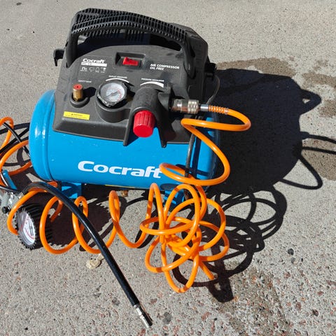 Portabel elektrisk luftpump i hårt plastfodral med slang och munstycke. Enkel att ta med och förvara, med tydliga knappar och manual i lådan.