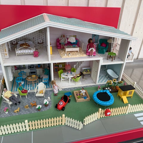 Stort dockhus med flera rum, poolområde och takterrass. Följer med olika möbler som säng, kök, matbord, solstolar och badrumsgrejer i färgglada färger. Lampa som lyser Helt nytt sedan jul, men blev dubblett så säljer ett. Allt ingår