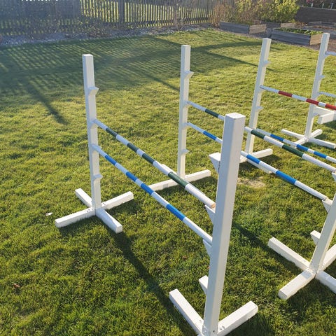 Hinder i trä. Två hinderstöd och två pinnar som går att flytta.