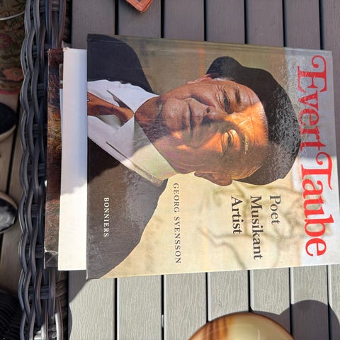 Fin fotobok om Evert Taube med titeln "En del av vår vardag och vår glädje". Mycket svartvita bilder och texter genom hela boken.