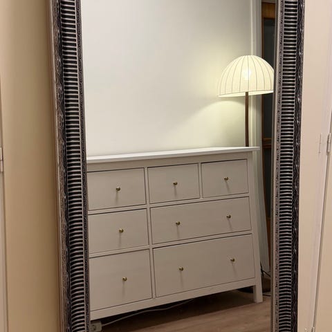 Stor rektangulär spegel med bred mörk träram och dekor runt kanten. Kan stå lutad mot väggen eller hängas upp, ger bra helkroppsvy.