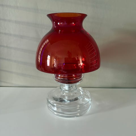 Klarglas samt rödtonat glas. Hållare för ljus i metall. Höjd 27 cm. Inget att anmärka på.