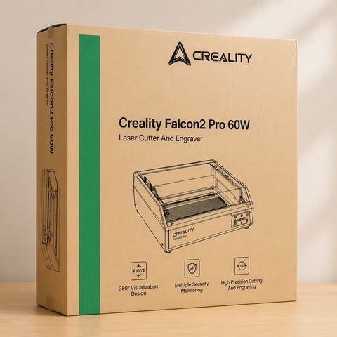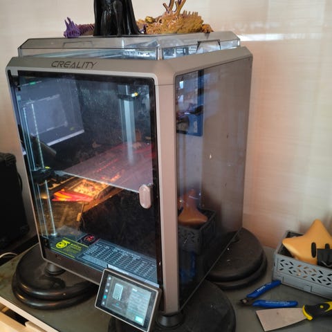 Creality K2 Plus Combo 3D-skrivare med inbyggt hölje och frontlucka. Har överdel för flera filamentrullar och tydlig display på framsidan.