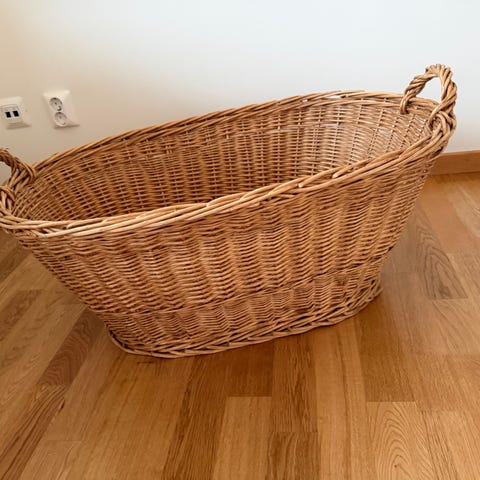 Stor korg i flätad rotting med två handtag på sidorna. Rymlig modell som står stadigt på golvet.