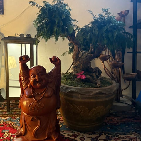 Fin Buddha-staty i svart, glänsande material med två figurer bredvid varandra. Detaljerat utförande med tydliga ansiktsdrag, draperad klädsel och mönstrat hår , mått stora är > ( B. 25 .cm - H. 42. cm ) > och andra liten är ( B.15.cm - H. 20. cm ) dem är fina gått som nytt , finns i Västerås .