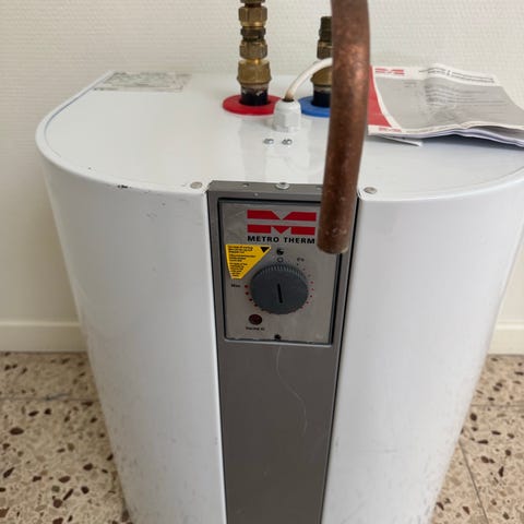 Utrustad med anslutningar för varm- och kallvatten samt säkerhetsventil enligt märkplåten.