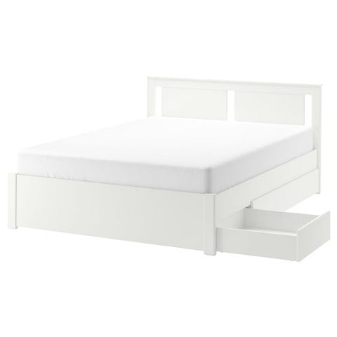Vit säng från IKEA med mått ca 120x200 cm. Har förvaringslådor under sängen som dras ut från sidan.