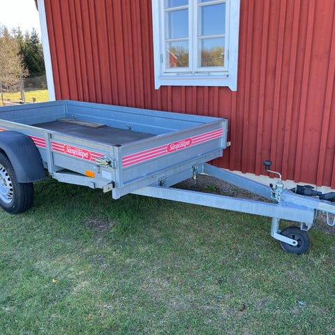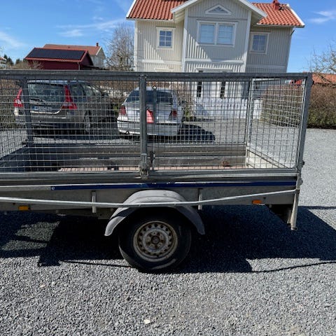 Smidig släpvagn med höga gallergrindar runtom, bra för att frakta skrymmande saker. Utrustad med tipp, bakljus och vanlig kulkoppling fram.