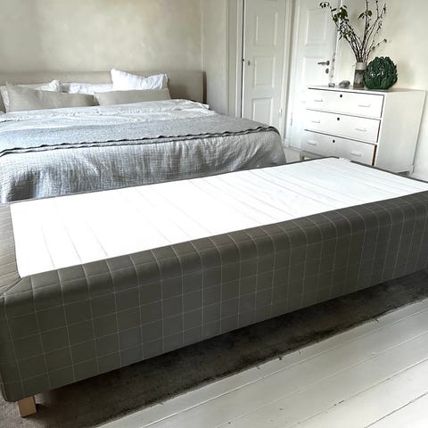 IKEA säng med grå resårmadrass, 90x200 cm, med quiltat tyg på sidorna. Medföljer metallben 20 cm höjd och vit förvaringslösning under sängen med flera fack.