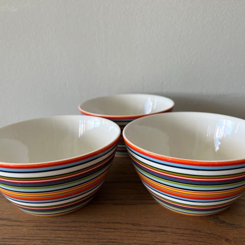 Iittala Origo porslin med randigt mönster i flera färger, 6 tallrikar 27 cm, 6 assietter 20 cm och 6 muggar. Fint set för bordet där delarna matchar varandra i samma serie.