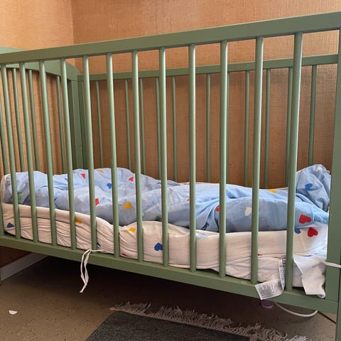 spjälsäng i trä med klassisk spjälram runtom. Madrass med mönstrat överdrag följer formen på sängen och ligger stadigt i botten.