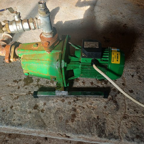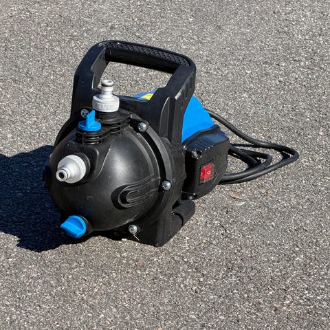Biltema Jet Pump BP 1301 på 1300W med flera anslutningar och kranar monterade. Praktisk bärhandtag och tydlig märkplåt med data på sidan. Sugslang ingår. Monterad på rigg, klar att ställa i strandkanten.