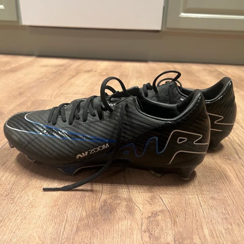 Nike Mercurial fotbollsskor i svart och blått med dold snörning och kardborreband över vristen. Dobbar under sulan och dragflik bak för lättare påtagning.
