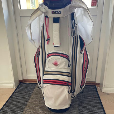 Cobra golfbag (vagnbag) i rosa och vitt med flera stora fack runt om. Har flertalet fack för klubbor och bärrem på sidan.