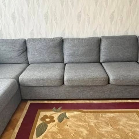 Stor grå hörnsoffa med schäslong och flera sittdynor. Tygklädseln är melerad och soffan har låg rygg och breda armstöd.