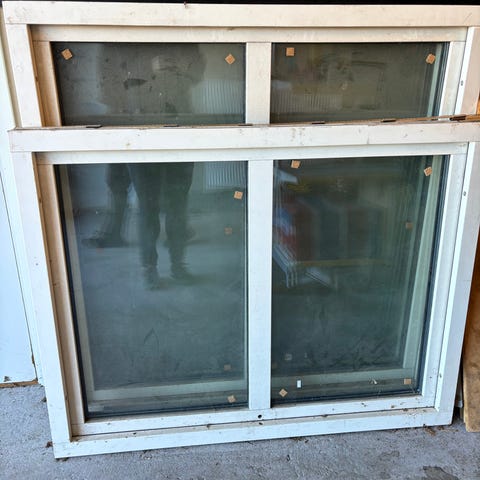 Dörr i aluminium med plastskiva och liten ventil nedtill. Har handtag och gångjärn på sidan. Suttit på ett växthus. Höjd 1,85 och bredd 1,30.