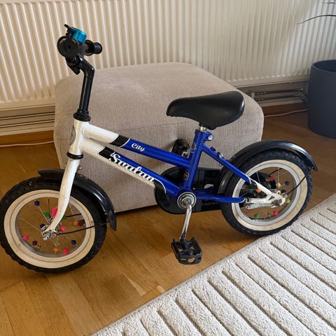 Logan barncykel med 12" hjul, svart med några blå detaljer. Utrustad med fotbroms, kedjeskydd och reflexer på hjulen.