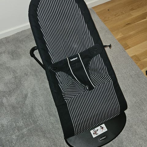 BabyBjörn babysitter i ljus färg med justerbart ryggstöd och trepunktssele. Följer med en extra mörk klädsel som enkelt knäpps på ramen.