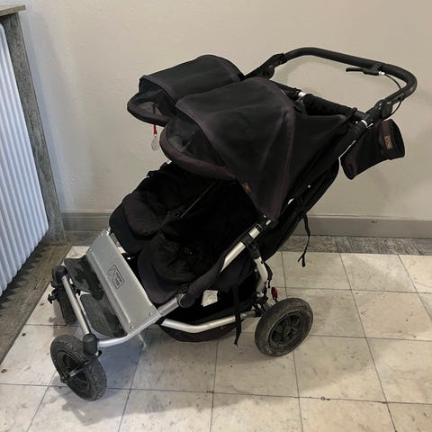 Mountain Buggy syskonvagn/dubbelvagn i grått utförande. Vagnen har två sittdelar bredvid varandra med individuella suffletter och fempunktssele. Till vagnen hör en liggdel i matchande färg samt en framåt vänd sittdel. Chassit har fyra hjul och fotstöd framtill. Sufflettdelarna har fönster för insyn och ventilation. Passar för två barn samtidigt, från liggdel till sittdel.