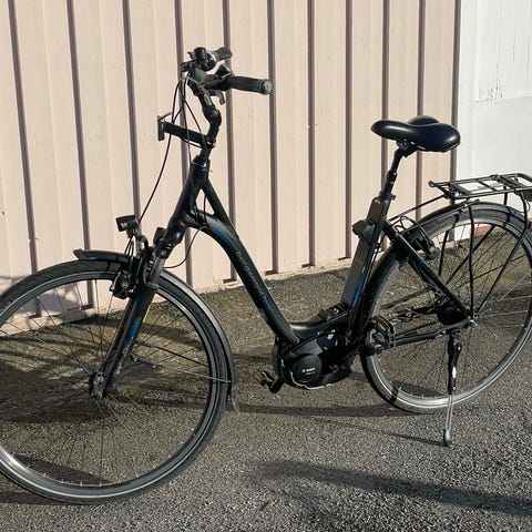 Svart elcykel modell V8 med breda däck och lång sadel. Har kraftig framlykta, baklykta, skärmar och display på styret. Skärm bytes till en större modell för en bättre koll.