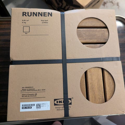 RUNNEN trall från IKEA i akacia för utomhusbruk, totalt 0,81 m² per paket. Klickas enkelt ihop till en trallmatta på balkong eller uteplats. IKEA Runnen balkongtrall säljes.