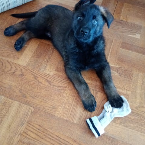 Snäll och trevlig blandras schäfer/ gråhund. Stor hund som kräver motion och gärna möjlighet att få använda nosen. Finns lite att jobba med men det tas vid intresse.