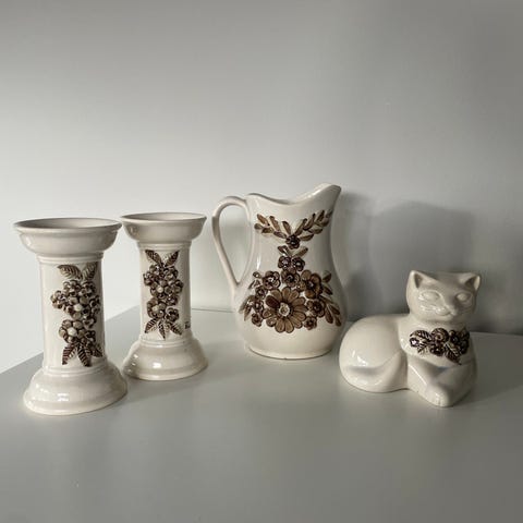 Keramikfigur märkt Charlotta Sweden undertill, föreställer en sittande kvinna. Brun och vit med rutmönster på klänningen och en liten bok eller bricka i knät.
