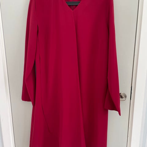 Grönrandig skjortklänning med krage och knappar framtill. Klänningen har långa ärmar med manschetter och en dekorativ fransdetalj runt midjan. Längden är cirka 98 cm från axeln till nederkanten.