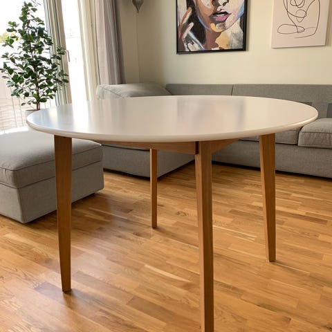 Runt matbord från Ellos i mörk träfärg med fyra raka ben. Passar bra som köks- eller matbord och har en slät bordsskiva i trä.