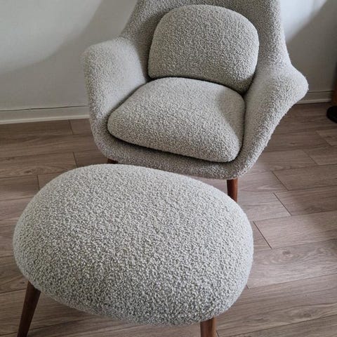 Välgjord replika av den klassiska Eames Lounge Chair med tillhörande fotpall. Inköpt ca 2009 och sparsamt använd. Bekväm med fin patina i lädret, inga sprickor eller större slitage. Två knappar saknas i sittdynan på fåtöljen. Enkelt för en tapetserare att fixa till en låg kostnad.