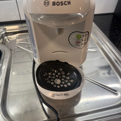 Dolce Gusto kapselmaskin i svart och vitt med reglage på ovansidan. Har hållare för mugg och droppbricka undertill. Väl använd, men fungerar som ny. Fanns ett märke i tanken längst upp när jag köpte den men är altså inte sönder så det påverkar inte funktionen. Och det är baktill så det syns inte heller. Men säljer extra billigt df.