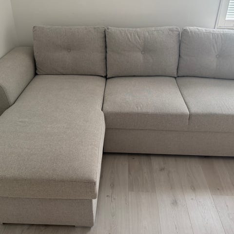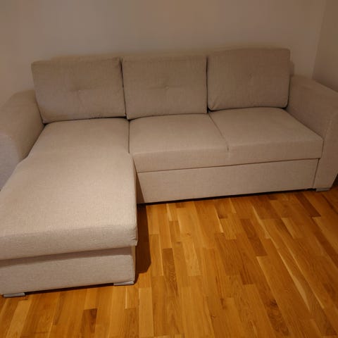 3-sits bäddsoffa med tygklädsel. Soffan görs enkelt om till en säng. Sittdynor med pocketfjädrar och skumstoppning. Ryggdynor i skum. Med förvaring. Kan spegelvändas.