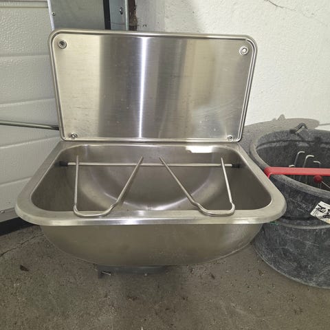 Diskbänk i rostfritt ( bredd 100x60cm) med djup ho och vit stomme med skåp och låda under samt avställningsyta bredvid hon. 2 st korgar ingår. Sämre skick på underdelen. OBS! Blandare ingår ej.