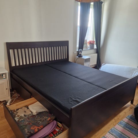 Vit metallram till säng från IKEA med dekorativa snirkliga detaljer i huvudgaveln. Passar en bredare säng, ungefär 160 cm, och har raka spjälor upptill.