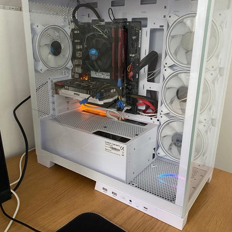 Asus stationär dator med Intel Core i5-7500, 16 GB DDR4 och Nvidia GTX 1650. Har snyggt chassi med RGB-front och flera fläktar inuti.