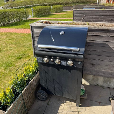 Weber klotgrill på vagn med sidobord och inbyggd termometer i locket. Med hjul undertill och galler som går att lyfta i mitten för enkel påfyllning av kol.